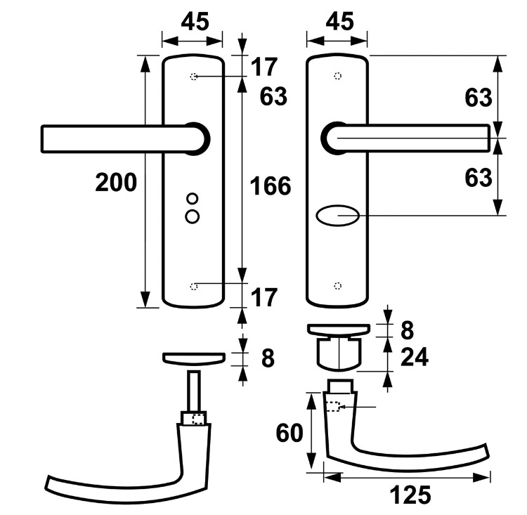 Ergonomisch vormgegeven deurklink en schilden.