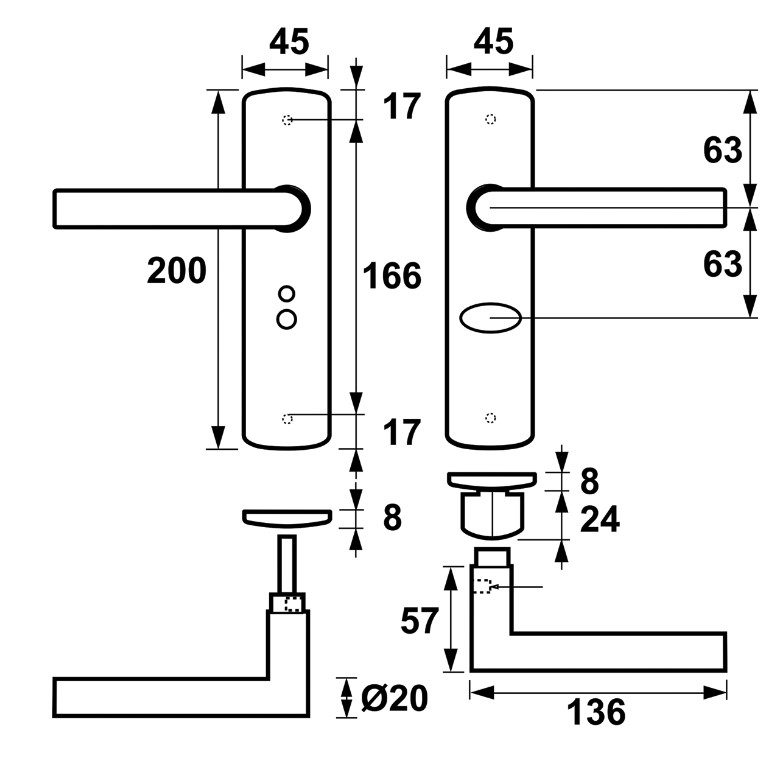 Ergonomisch vormgegeven deurklink en schilden.