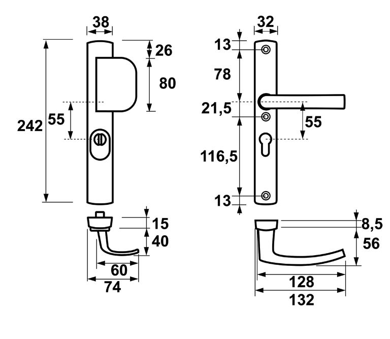 standaard toepasbaar op deuren van 38 tot 54 mm dik, voor dikkere deuren zijn verlengde krukstiften en bouten leverbaar