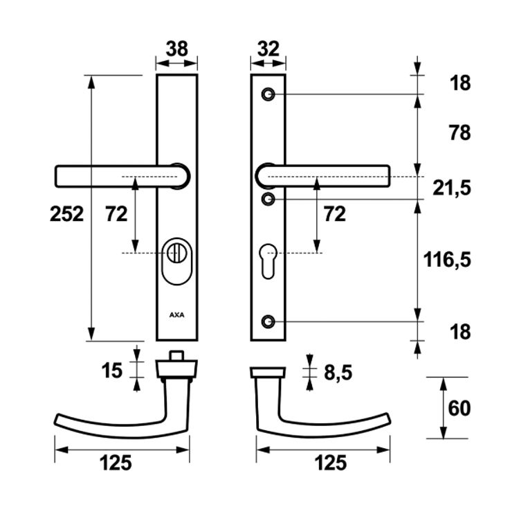 - standaard toepasbaar op deuren van 38 tot 54 mm dik, voor dikkere deuren zijn verlengde krukstiften en bout leverbaar