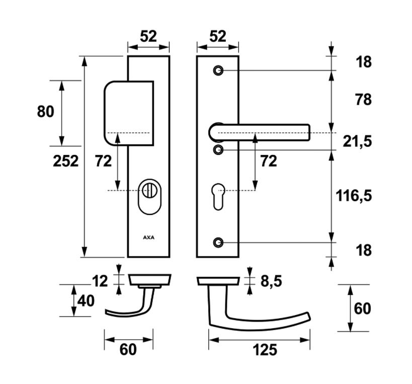 - standaard toepasbaar op deuren van 38 tot 54 mm dik, voor dikkere deuren zijn verlengde krukstiften en bout leverbaar