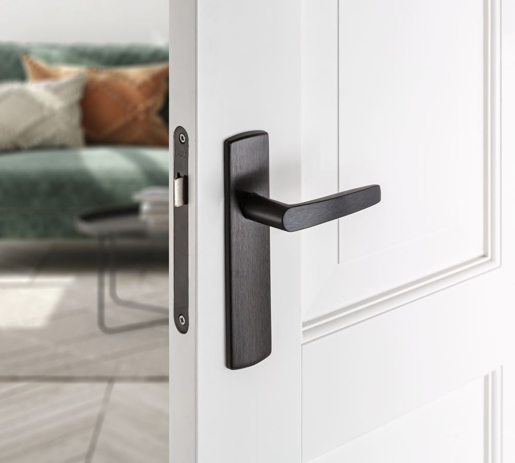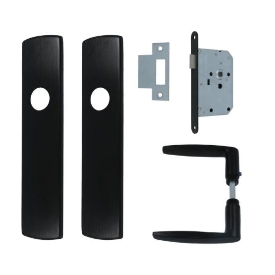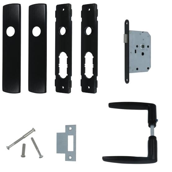 Complete set van AXA binnendeurbeslag. De set bestaat uit een Loopslot met zwarte voorplaat, rechthoekige sluitplaat, patentboutjes t.b.v. deuren t/m 40 mm en een set aluminium deurkrukken op schild zwart.