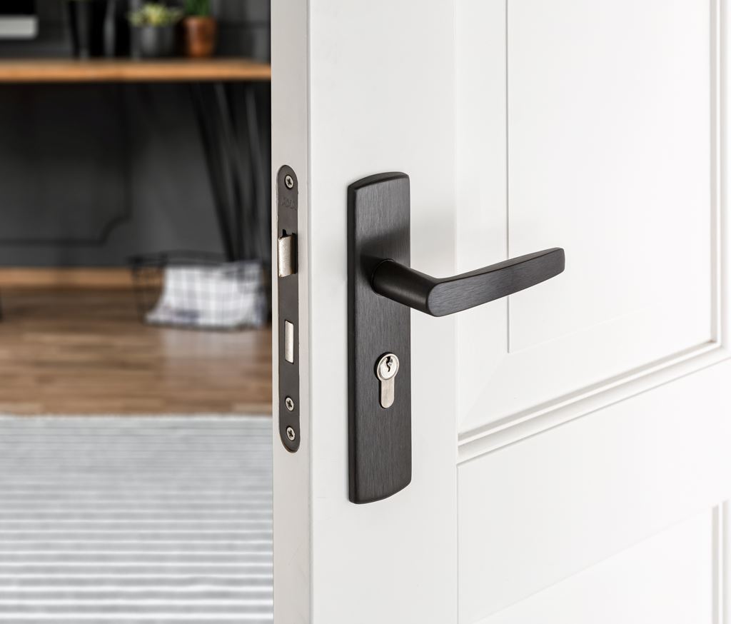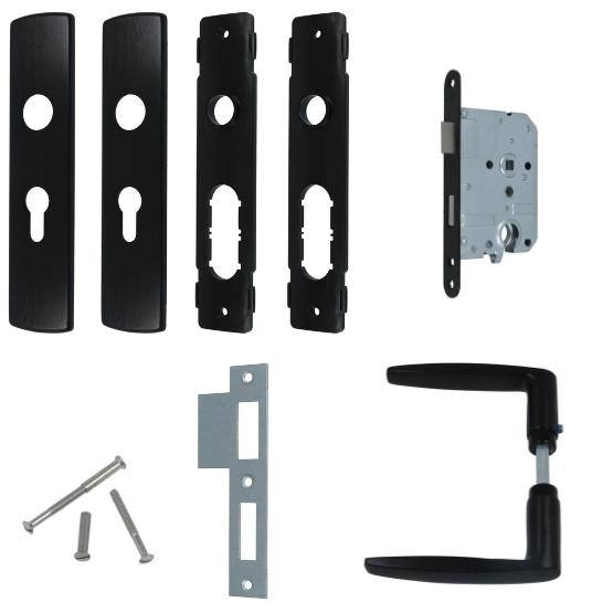 Complete set van AXA binnendeurbeslag. De set bestaat uit een dag-nachtslot cilinder met zwarte voorplaat, rechthoekige sluitplaat, patentboutjes t.b.v. deuren t/m 40 mm en een set aluminium deurkrukken op schild zwart.