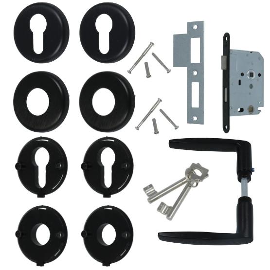 Complete set van AXA binnendeurbeslag. De set bestaat uit een dag-nachtslot cilinder met zwarte voorplaat, rechthoekige sluitplaat, patentboutjes t.b.v. deuren t/m 40 mm en een set rozetten, pc-plaatjes en deurkrukken. (Exclusief Cilinder! zie gerelateerde producten)