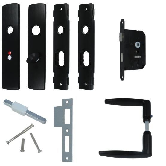 Complete set van AXA binnendeurbeslag. De set bestaat uit een toilet-badkamerslot met zwarte voorplaat, rechthoekige sluitplaat, patentboutjes t.b.v. deuren t/m 40 mm en een set aluminium deurkrukken op schild zwart.
