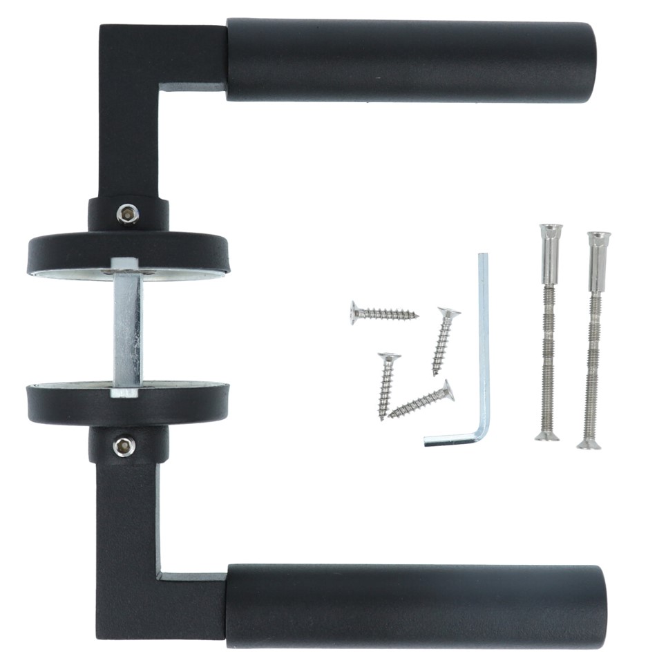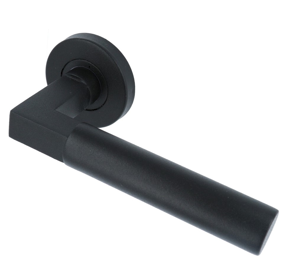 Het deurbeslag is uitgevoerd in rvs en heeft een finish van een mat zwarte poedercoat. De deurklink heeft uiteraard ook een bijpassend PC-plaat, sleutel-plaat en WC sluiting uit dezelfde serie. Zie de “Relevante producten”