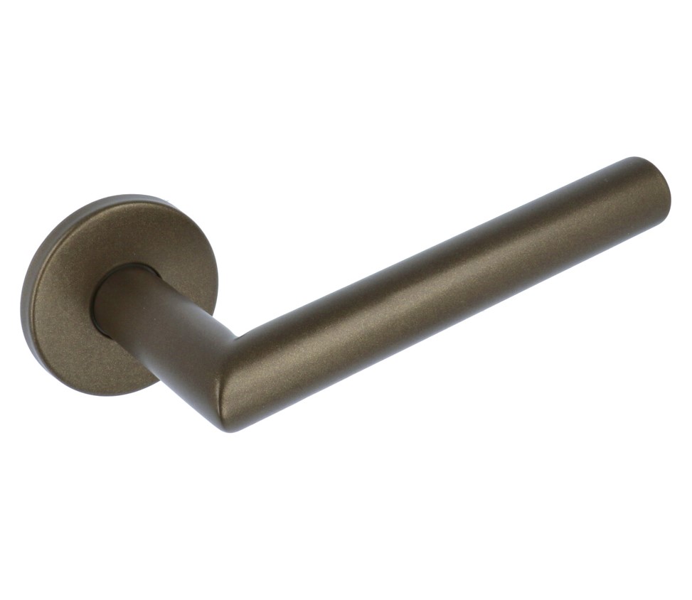 Het deurbeslag is uitgevoerd in RVS en voorzien van een donker bronzen poedercoat. De deurklink heeft uiteraard ook een bijpassend PC-plaat, sleutel-plaat, WC-sluiting en draaikiepgarnituur uit dezelfde serie. Zie de “Relevante producten”