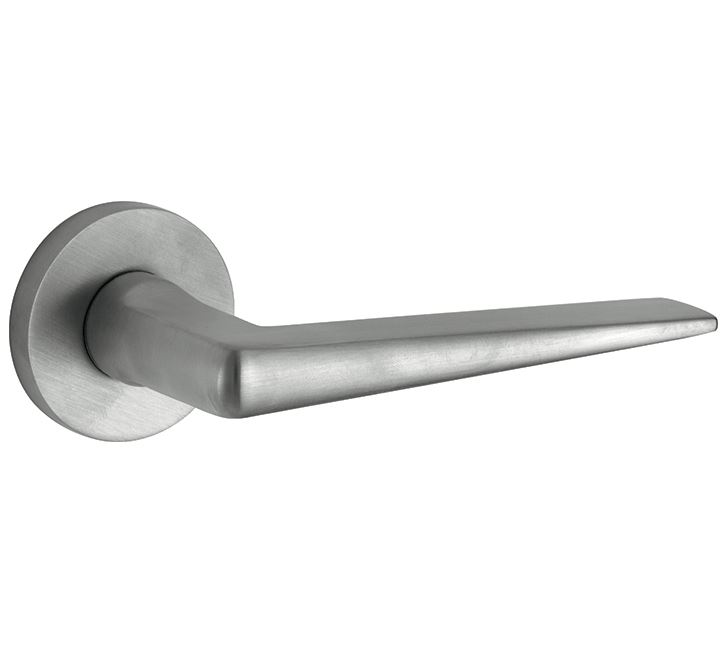 Deurklink op rozet. Het krukrozet is geveerd (voorkomt hangende deurklinken) en de schroefbevestiging op de deur is niet zichtbaar.