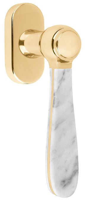 Dit is een draaikiepgarnituur. De raamsluiting is van Formani uit de serie BOSCO. De ontweper is LÁZARO ROSA-VIOLÁN. Het materiaal is messing ongelakt/Carrara marmer.