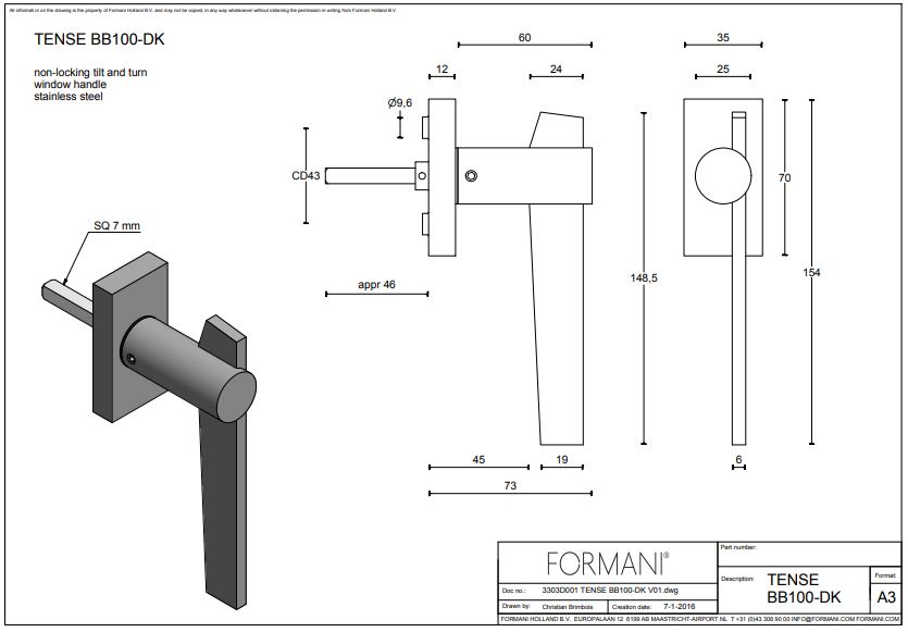 Dit is een draaikiepsluiting. Deze kunt u monteren op draaikiep ramen en deuren. (kiep kantel)Â De raamsluiting is van Formani uit de serie TENSE, van de designer