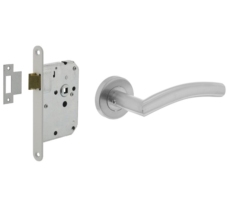 Deze deurbeslag set voor binnendeuren bestaat uit een loopslot met een bijpassende deurklink. Het loopslot heeft een doornmaat van 50 mm en wordt geleverd inclusief sluitplaat en een witte afgeronde voorplaat. Voor het slot kunt u dezelfde inbouw- en freesmaten gebruiken als een standaard woningslot. De dagschoot van dit slot is omwisselbaar. Dat wil zeggen dat deze voor zowel naar linksdraaiende als rechtsdraaiende deuren geschikt is. Deurklink Lisa/hoek 90° op ronde geveerde rozet is vervaardigd uit roestvast staal en is naderhand geborsteld. Door het gebruik van rvs heeft dit product een lange levensduur. De rozet heeft een afmeting van ø 53×9 mm en heeft een stalen onderconstructie. Deze deurklink is geschikt voor een deurdikte van 38 – 42 mm en wordt per paar geleverd inclusief bevestigingsmateriaal.