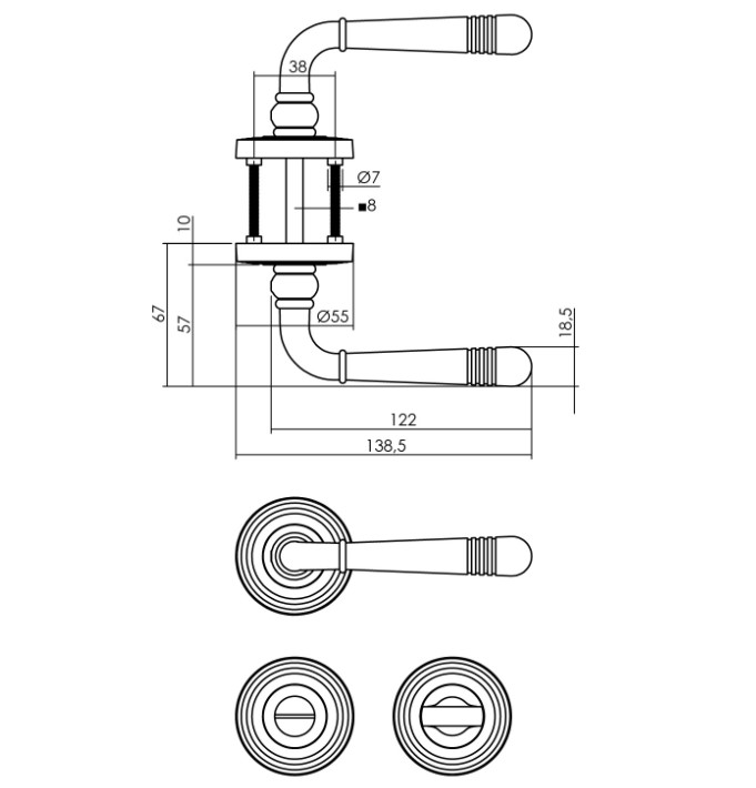Deurkruk Helena, vastdraaibaar met veer op ronde rozet. Met rillen Ø54×9 mm. Wordt geleverd inclusief wc-sluiting met stift 8×8 mm.