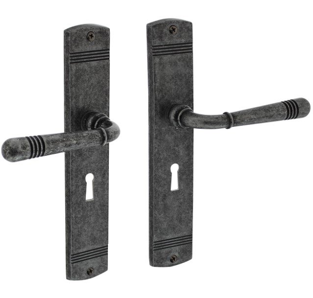 Deurklink Helena vastdraaibaar met veer op langschild ovaal. Oud grijs. De hart op hart maat van de deurklink tot het sleutelgat is 56 mm.