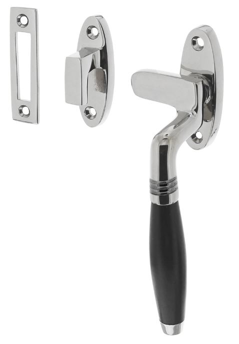 Deze raamsluiting Ton met ebbenhouten greep is uitgevoerd in chroom en is naderhand gepolijst, waardoor hij een glanzend uiterlijk heeft. Deze sluiting in rechter uitvoering wordt geleverd inclusief sluitplaat en sluithaak, zodat u zelf de keuze kunt maken of u de sluiting in of op het kozijn wilt monteren. Deze raamsluiting met schroefgaten wordt per stuk geleved inclusief bevestigingsmateriaal voor montage.