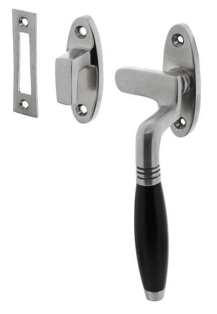 Deze raamsluiting Ton met ebbenhouten greep is uitgevoerd in mat chroom. Deze sluiting in rechter uitvoering wordt geleverd inclusief sluitplaat en sluithaak, zodat u zelf de keuze kunt maken of u de sluiting in of op het kozijn wilt monteren. Deze raamsluiting met schroefgaten wordt per stuk geleved inclusief bevestigingsmateriaal voor montage.