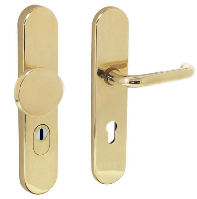 Deze ovale set voordeurbeslag met bescherming tegen inbraak is SKG3 gekeurd. Deze set heeft een vaste greep en een bijpassende kruk en is vervaardigd uit messing en naderhand gepolijst en voorzien van een laklaag, waardoor het een glanzende uitstraling krijgt. Het veiligheidsbeslag heeft een profielcilindergat maat van 72 mm en is voorzien van kerntrekbeveiliging, waardoor de cilinder wordt beschermt tegen het uittrekken en uitboren van de cilinderkern. Kerntrekbeveiliging is sinds eind 2013 een verplicht in nieuwbouw en sinds april 2014 ook voor bestaande bouw. Het veiligheidsbeslag is daarnaast SKG3 gekeurd, wat betekent dat het om extra zwaar inbraakwerend beslag gaat.