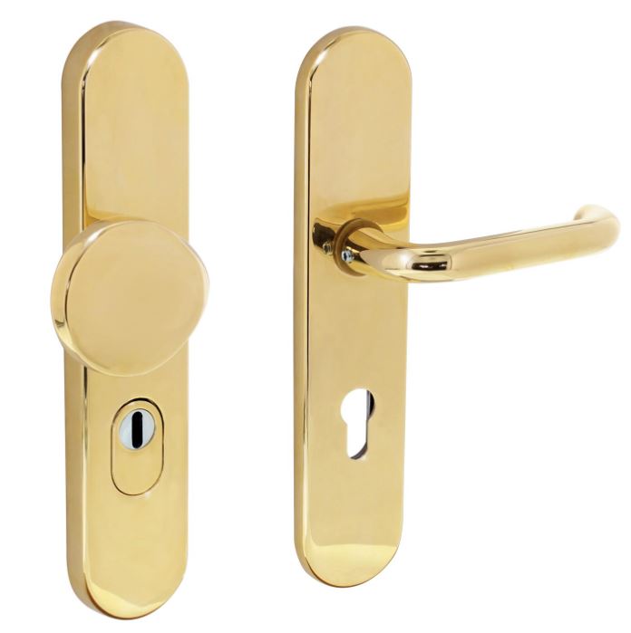 Deze ovale set voordeurbeslag met bescherming tegen inbraak is SKG3 gekeurd. Deze set heeft een vaste greep en een bijpassende kruk en is uitgevoerd in messing en wordt naderhand gepolijst, waardoor het een glanzend uiterlijk krijgt. Een messing product dat alleen gepolijst is en niet van een laklaag is voorzien, zal dof en donker worden. Dit is de natuurlijke uitstraling van messing. Producten worden om deze reden vaak onbehandeld gelaten. Echter, mits regelmatig gepoetst, blijft messing zijn glans behouden.