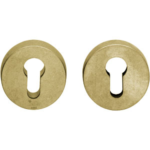 Ronde set veiligheidsrozetten met profielcilindergat en SKG3 keurmerk. Dit product wordt uitgevoerd in messing en wordt naderhand getrommeld, waardoor het een dof en donker uiterlijk krijgt.
