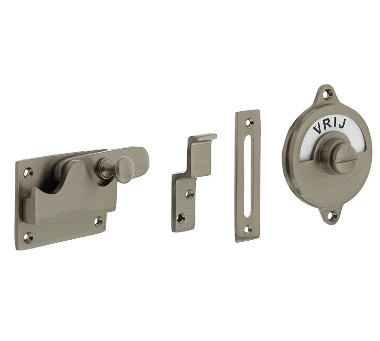 Een wc-overslag zorgt ervoor dat u een deur gemakkelijk kunt openen en afsluiten. Deze wc-overslag is uitgevoerd in nikkel en naderhand geborsteld, waardoor het een matte uitstraling krijgt. Daarnaast is deze toiletsluiting voorzien van emaille plaatje met de tekst vrij / bezet. Deze wc-overslag vlak is geschikt voor naar binnendraaiende toilet-/badkamerdeuren en is zowel links als rechts op de deur te plaatsen. Tevens is deze wc-overslag voorzien van schroefgaten en wordt geleverd inclusief sluithaak en sluitplaat, zodat u zelf de keuze kunt maken of u de sluiting op of in het kozijn wilt monteren. Tot slot bevat deze set bevestigingsmateriaal voor montage.