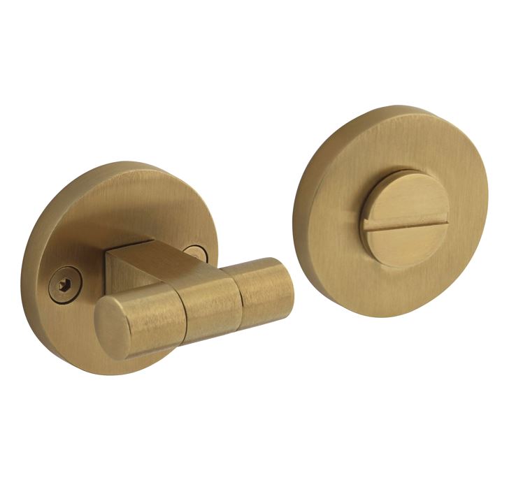 Deze toilet-/badkamersluiting met bediening links is speciaal ontworpen om te combineren met deurkruk Shiraat, winnaar van de Red Dot Design Award 2022. De wc-sluiting is vervaardigd uit roestvast staal en naderhand voorzien van een hoogwaardige PVD coating in de kleur mat messing. De rozet heeft een afmeting van ø55×8 mm en is éénzijdig verdekt. Dit betekent dat maar één kant van de deur zichtbare schroefgaten heeft. Dit product wordt per set geleverd inclusief bevestigingsmateriaal voor montage.