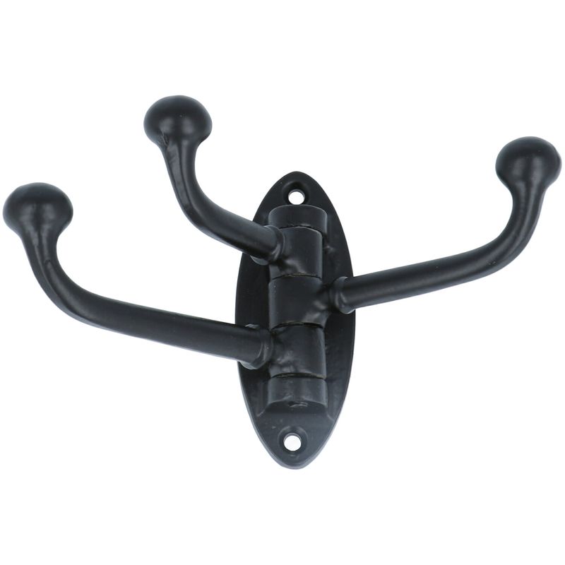 Deze stoere zwarte kapstokhaak zien we steeds vaker terug in het industriële en landelijke interieur. De kapstokhaak is verstelbaar en bestaat uit drie jashaken met ronde kop. Een veelzijdige garderobe haak die draaibaar is naar beide kanten. Geschikt voor zowel jassen, tassen, sjaals en paraplu’s. De kapstok biedt minimaal ruimte voor twee items per haak.