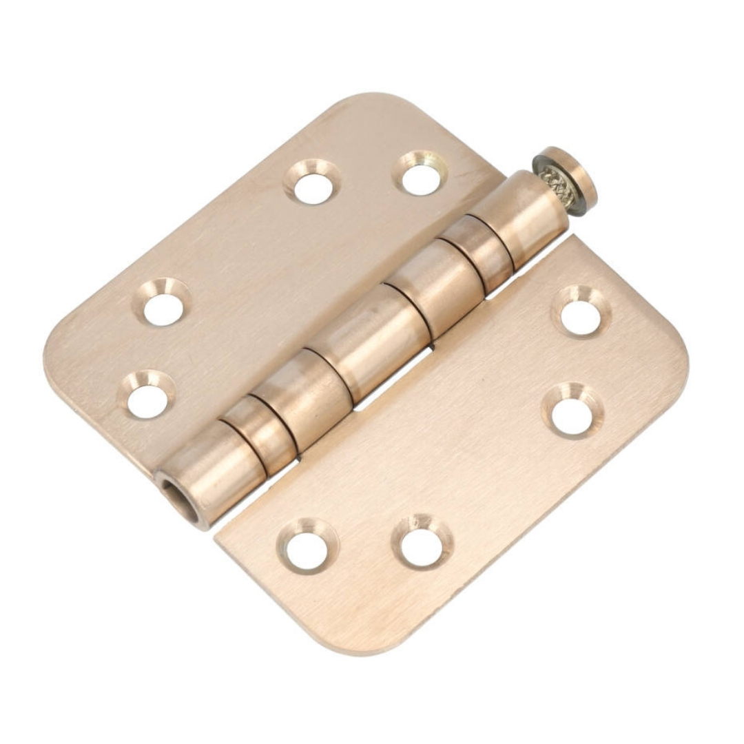 Dit kogellagerscharnier heeft ronde hoeken. De maat van dit scharnier is 89 x 89 mm en de dikte 2.4 mm. Het materiaal is roestvast staal met een PVD licht bronzen coating.