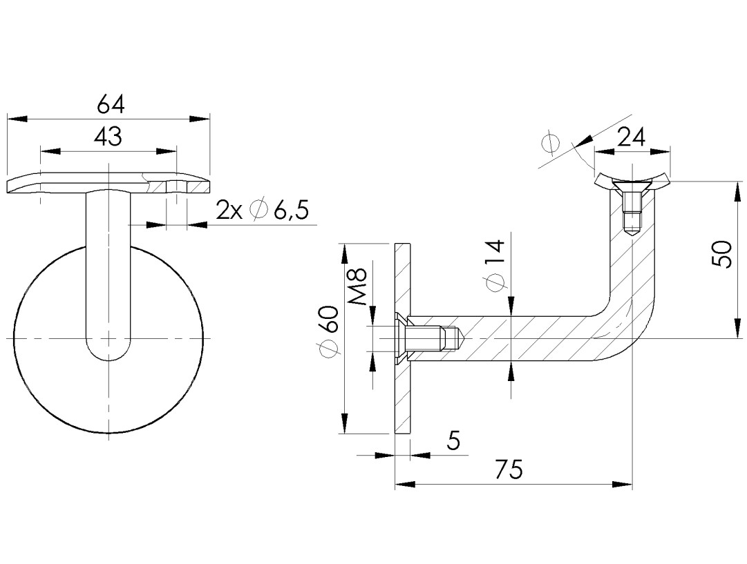 De leuninghouder komt 83 mm naar voren en is 57 mm hoog.