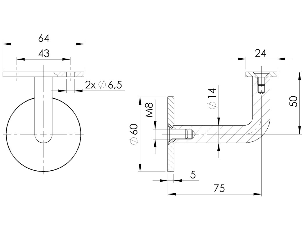 De leuninghouder komt 83 mm naar voren en is 57 mm hoog.