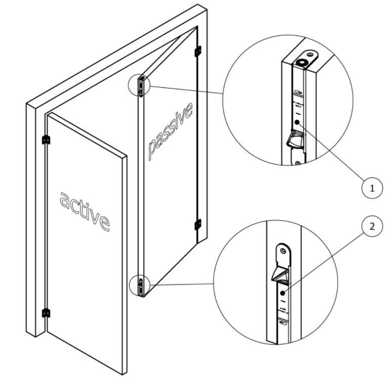 Voor de aanschaf is het belangrijk om te bepalen of je een type 1 of type 2 kantschuif nodig hebt. Dit is afhankelijk van de draairichting van de passieve deur. Per passieve deur heb je van beide types een kantschuif nodig. Dit geldt ook wanneer je de type 34 combineert met de type 35. Voor een DIN rechtsdraaiende passieve deur gebruik je een type 1 kantschuif bovenaan en een type 2 onderaan de deur. Voor DIN links een type 1 kantschuif onderaan en type 2 bovenaan.