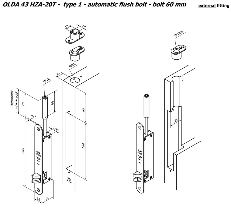 Olda automatische kantschuif type 43 doornmaat 20mm voor stalen/aluminium/houten deuren type 1 staal verzinkt