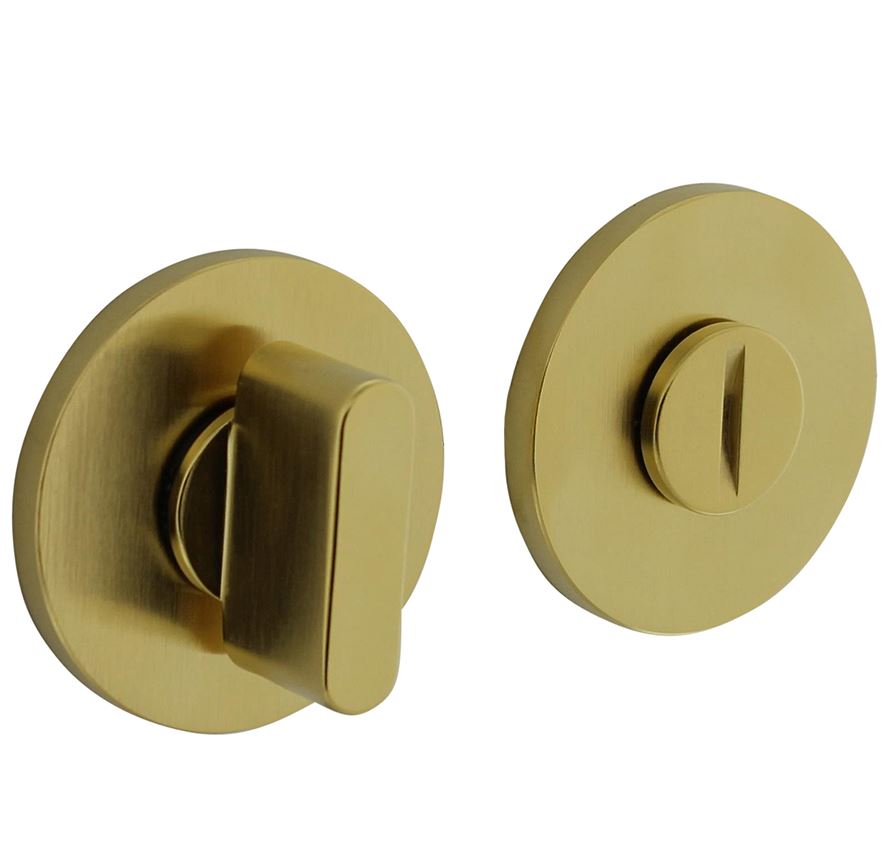 Een toilet-/badkamersluiting zorgt ervoor dat u een deur gemakkelijk kunt openen en afsluiten. Deze rozet met toilet-/badkamersluiting is uitgevoerd in messing en voorzien van een hoogwaardige matte messingkleurige PVD coating. Door deze speciale behandeling, is de finish van een buitengewone kwaliteit. Hierdoor is het behoud van de oorspronkelijke finish gegarandeerd voor een periode van 30 jaar. Deze ronde toilet-/badkamersluiting is voorzien van nokken (doorgaande bevestiging) en wordt per set geleverd.