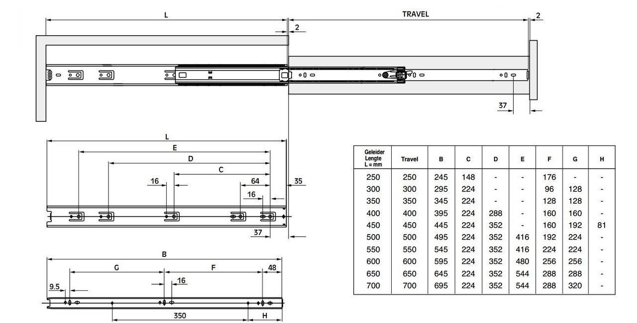 Inbouwdikte 12,7 mm per ladegeleider. De hoogte van deze ladegeleider is 45 mm.
