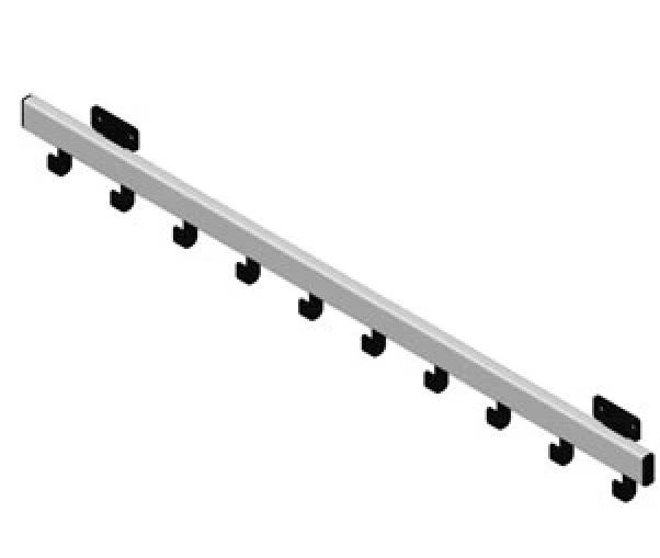 Wandkapstok met 10 haken die in een rails onder de balk hangen.