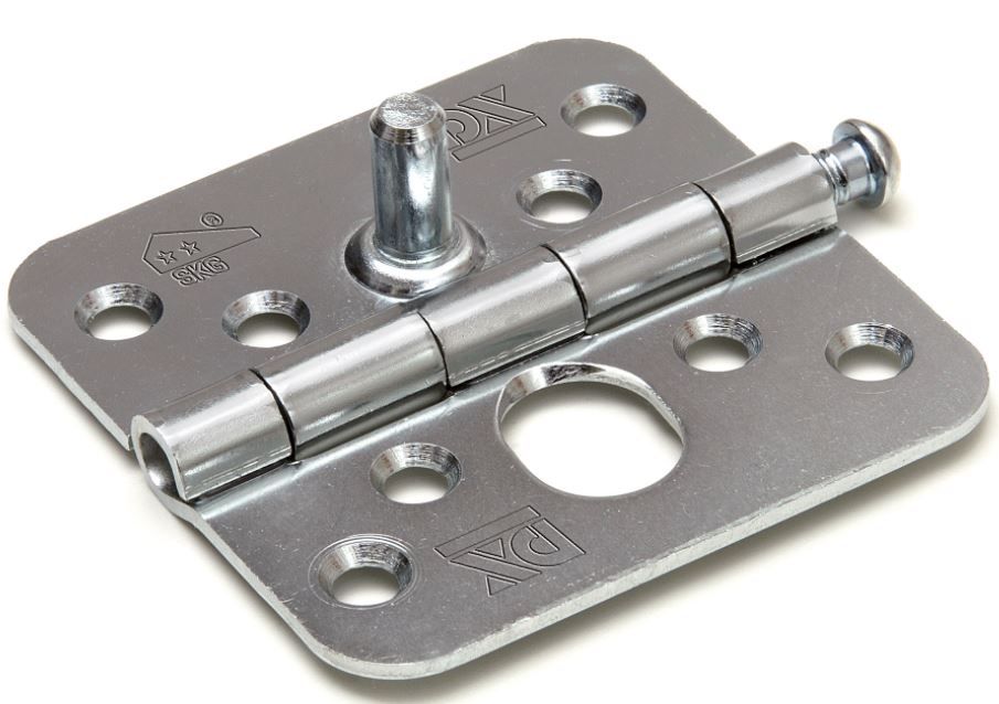 Dit scharnier heeft ronde hoeken en 2 SKG sterren (zwaar inbraak werend). De maat van dit scharnier is 76 x 76 mm. Het materiaal is staal verzinkt met een losse verzinkte pen.