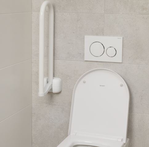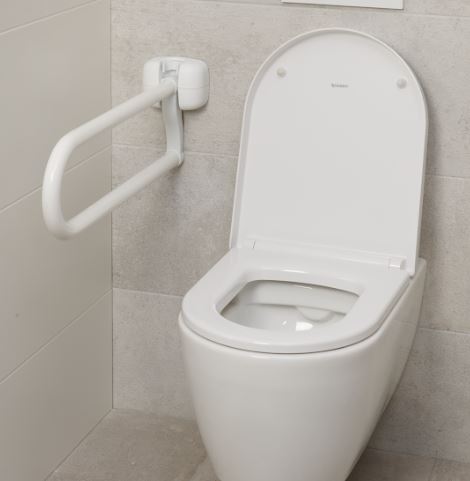 De beugel kan omhoog geklapt worden en blijft door de klemfunctie ook omhoog staan. Daardoor zit deze niet in de weg wanneer de toiletbeugel niet nodig is. Ook is het mogelijk om in de wandbeugel een houder voor een toiletrol te plaatsen, zodat deze gemakkelijk bereikbaar is op het toilet.