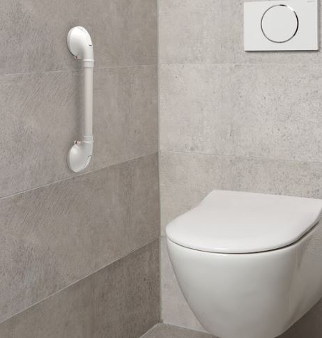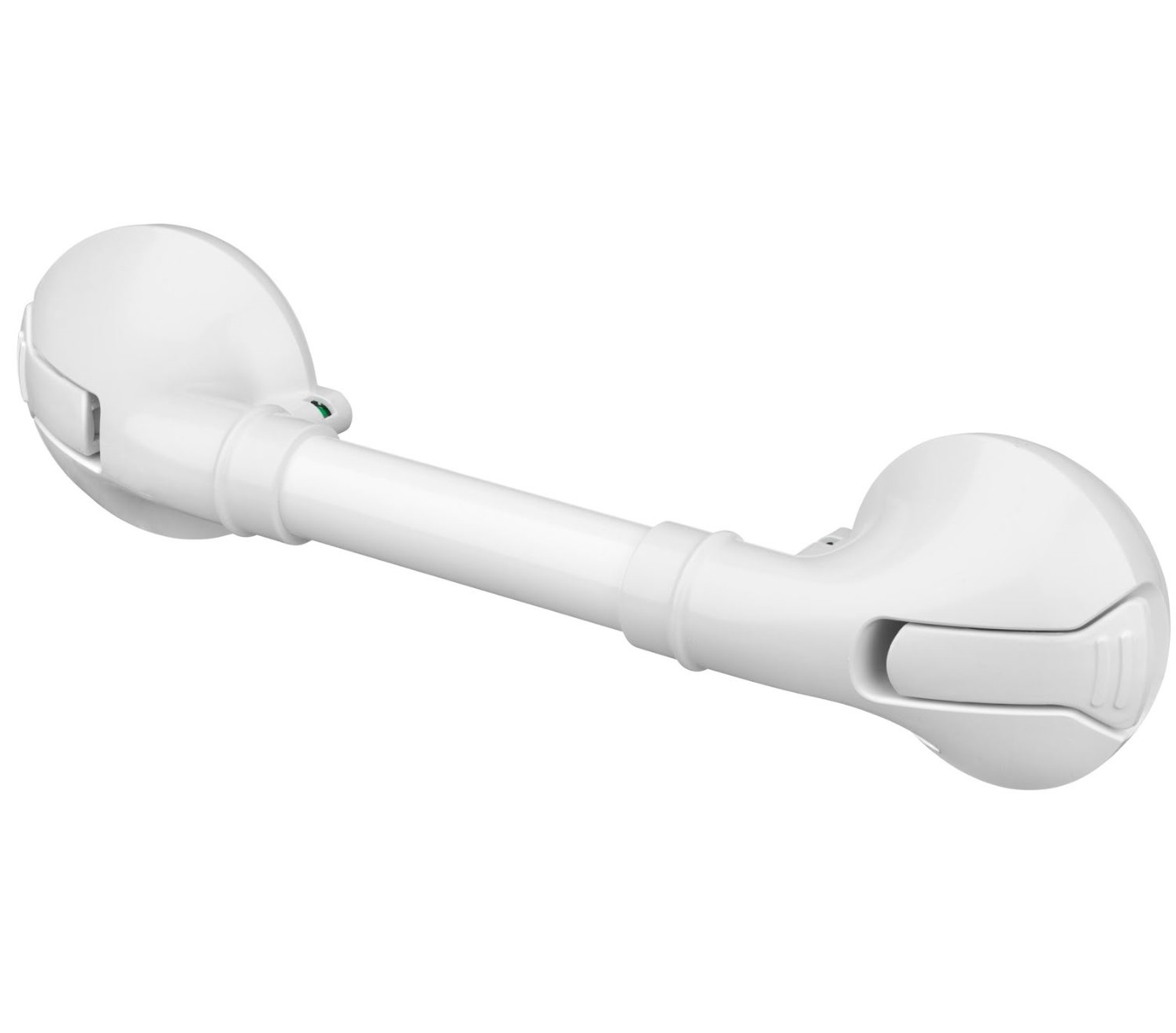 De beugel wordt door middel van twee vergrendelingen muurvast op de (gladde) ondergrond vastgezet. De rood/groene visuele indicatoren geven aan of de wandbeugel goed vast zit en blÃjft zitten. De greep is voorzien van een comfort grip voor extra houvast en is vervaardigd van corrosie bestendig metaal. De kappen zijn van slagvast ABS.