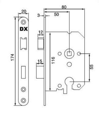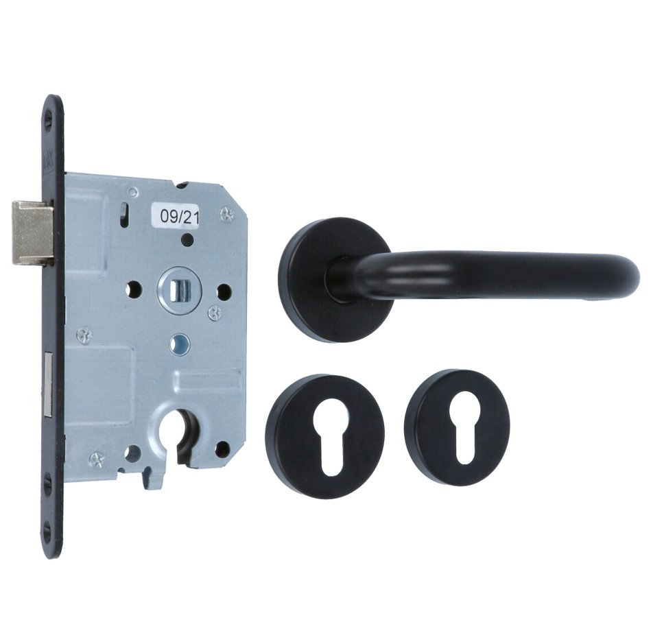 Complete set van binnendeurbeslag. De set bestaat uit een cilinder insteekslot met zwarte voorplaat, rechthoekige sluitplaat, patentboutjes, set cilinderplaatjes en deurklink model 3RX op rozet.