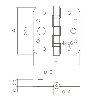 Kogellagerscharnier met ronde hoeken en ingebouwde dievenklauw. Scharnierpen demontabel. 304 rvs geborsteld. Bij dit scharnier worden schroeven geleverd.