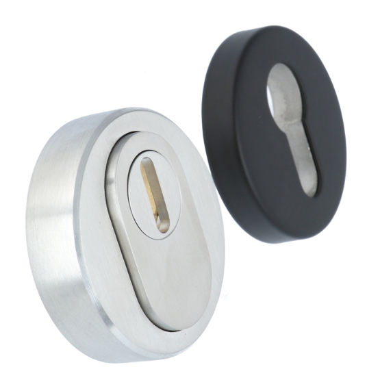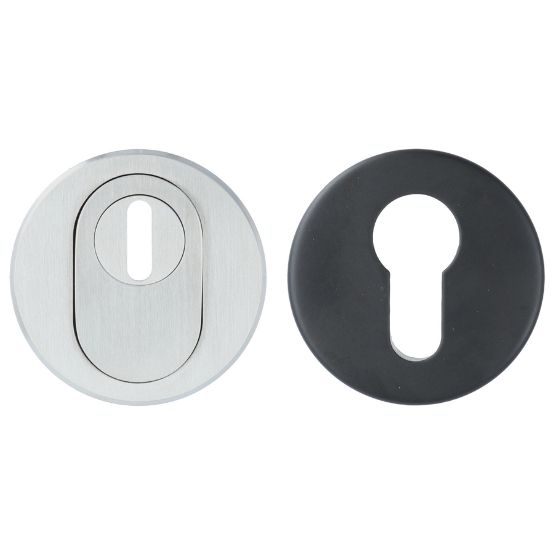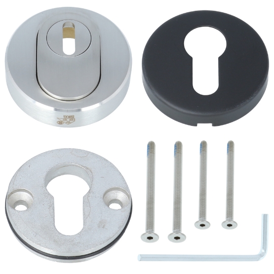 Dit is een veiligheidsrozet met kerntrekbeveiliging. Deze set bestaat uit 2 finishes. Zo heeft u een rvs buitenrozet en een zwart binnen rozet. Hierdoor kun je al het beslag buiten in rvs nemen en binnen in het zwart.