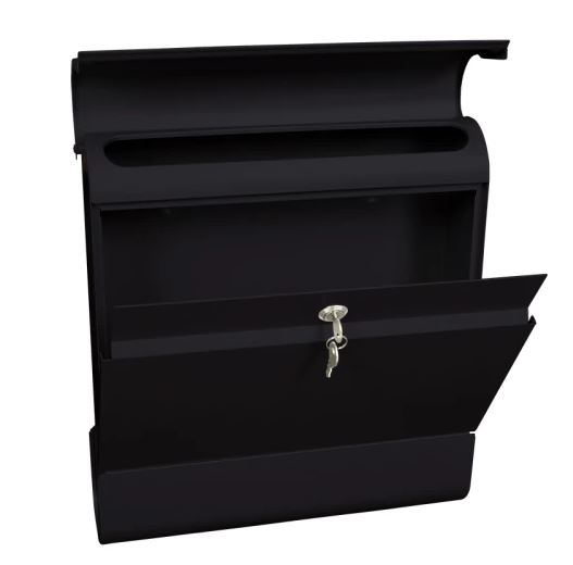 Wandbrievenbus van gepoedercoat gegalvaniseerd staal voorzien van cilinderslot. De inworpopening (32,5 x 3 cm) bevindt zich onder de klep, waardoor de post beschermd is. Met krantenvak aan de onderzijde van de brievenbus.