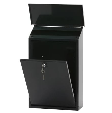 Brievenbus met cilinderslot voor wandbevestiging. De inworpopening (25 x 4 cm) zit onder de klep zodat de post beschermd is.