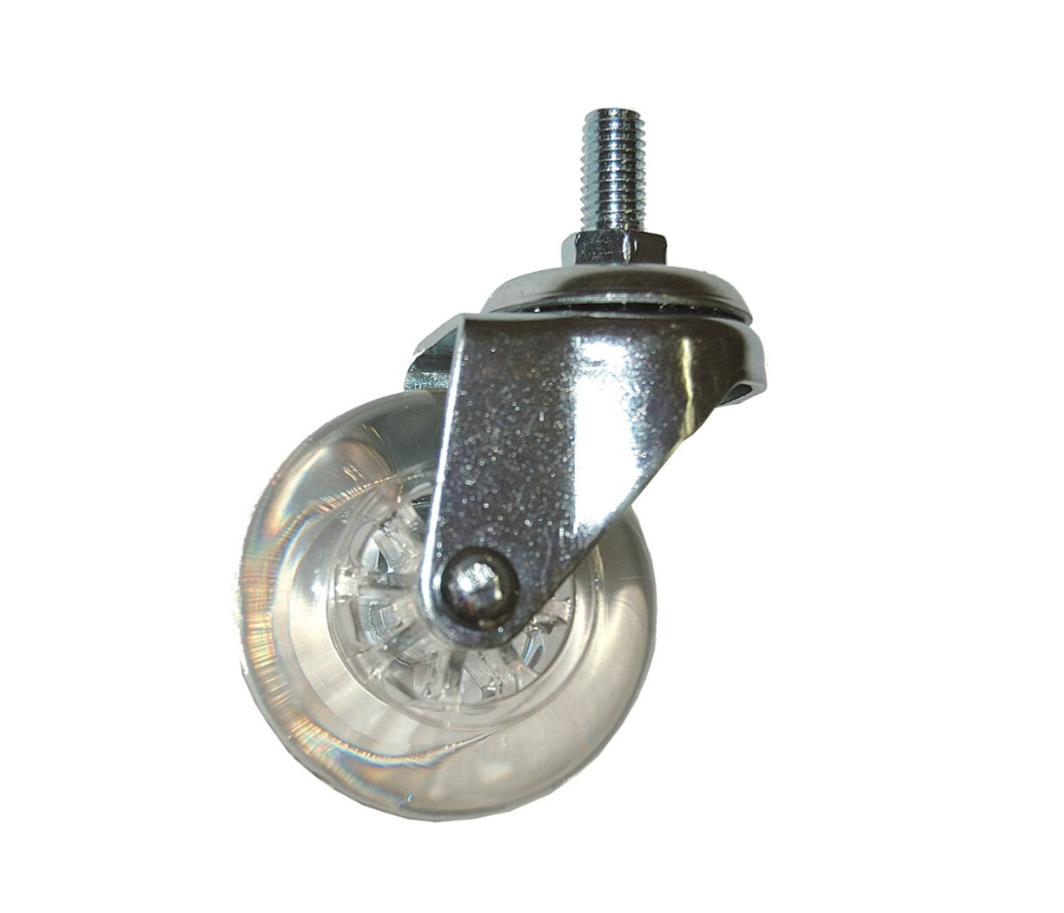Het wiel van dit zwenkwiel is van transparant kunststof.